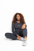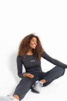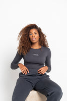 Charcoal grey fitted long sleeve top, with “Eunoia” embroidery detail on the front. Designed to perfectly match our basic joggers and shorts (sold separately)
